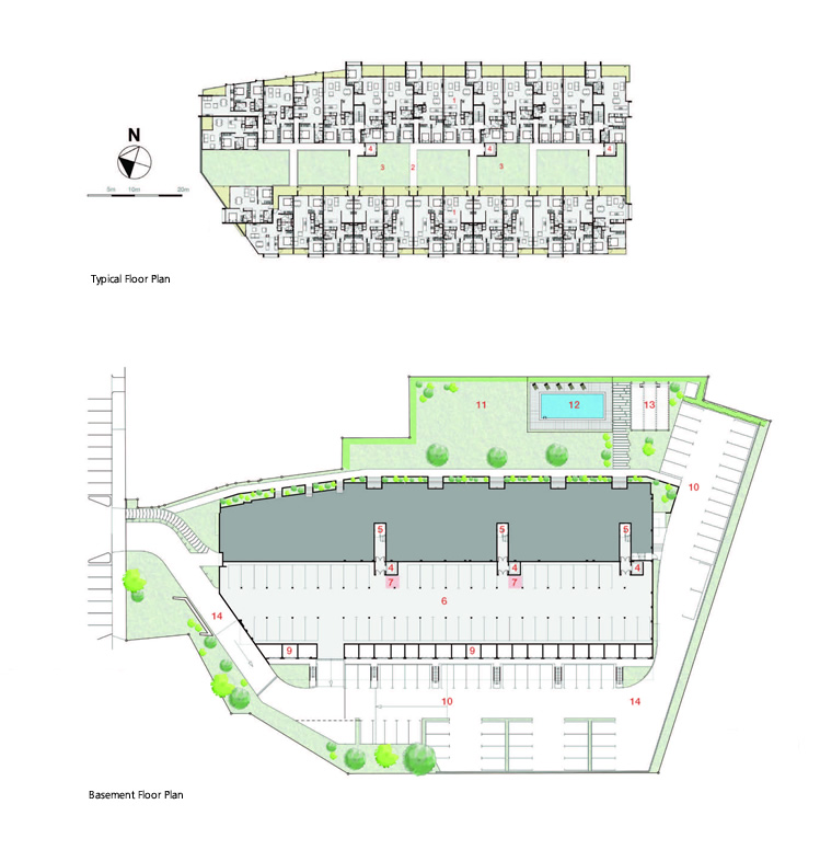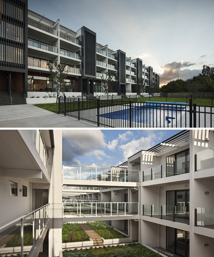 The development comprises of two linear blocks and with a call to create community spaces forming the condominium experience, generous zones for informal interaction in shared landscapes were provided. The two blocks are internally connected with a series of walkways and floating bridges, the north side of the development features communal areas with barbeques under a vast timber pergola structure with swimming pool. Dark louvers and concrete panels break up the horizontal form to moderate the development's scale with in its suburban surrounding.